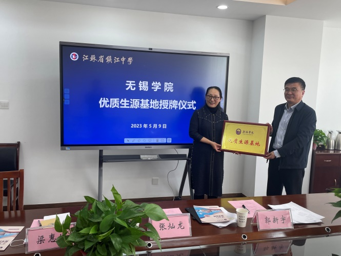 为更好的宣传学校招生政策,加强与重点生源学校的交流,5月9日,校党委常委、副校长梁惠娥带队赴镇江中学开展“优秀生源基地”授牌仪式。学工处处长张灿龙、传媒与艺术学院副院长刘棠,传媒与艺术学院分团委书记郭新宇参加会议。会议由镇江中学党委书记冯章葆主持。