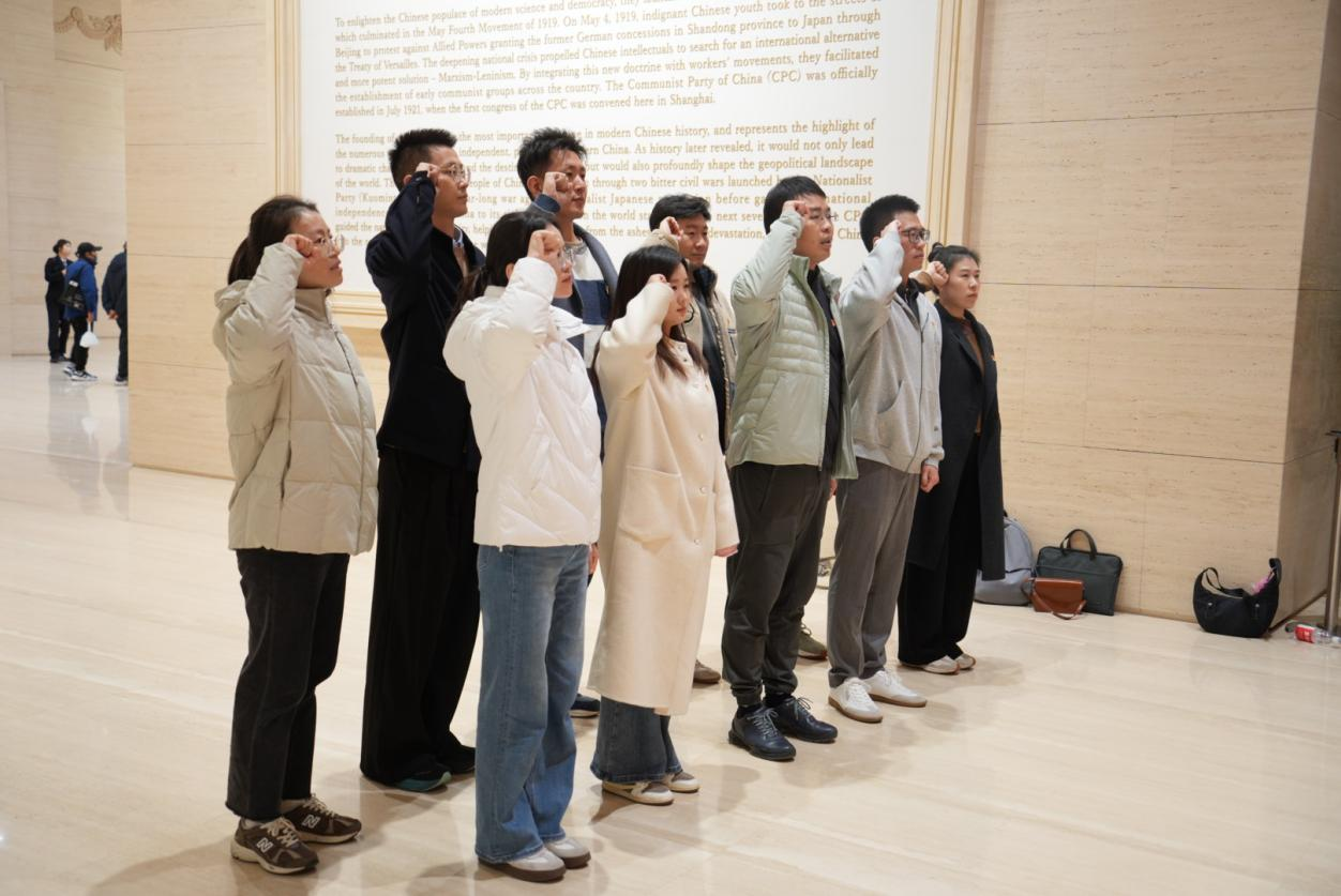 在讲解员的引导下,师生党员代表循着历史脉络,依次参观了“前仆后继、救亡图存”“民众觉醒、主义抉择”“早期组织、星火初燃”“开天辟地、日出东方”“砥砺前行、光辉历程”等主题展区。展区内,泛黄的书信手稿承载着革命先辈的赤胆忠心,锈迹斑斑的枪械见证着峥嵘岁月的浴血荣光,生动的影像资料与沉浸式场景复原则将大家带回了那个风雨如晦却又充满希望的年代。党员们驻足凝视、认真聆听,系统回顾了中国共产党从萌芽、诞生到逐步发展壮大的辉煌历程,深刻感悟到早期共产党人在艰难险阻中坚守信仰、在救亡图存中勇担使命的不屈品格与无私情怀。在庄严肃穆的纪念馆宣誓大厅,全体党员佩戴党徽,举起右拳,重温入党誓词。铿锵有力的誓言回荡在大厅内,更烙印在每一位党员的心中,这既是对入党初心的郑重回望,也是对使命担当的庄严承诺。