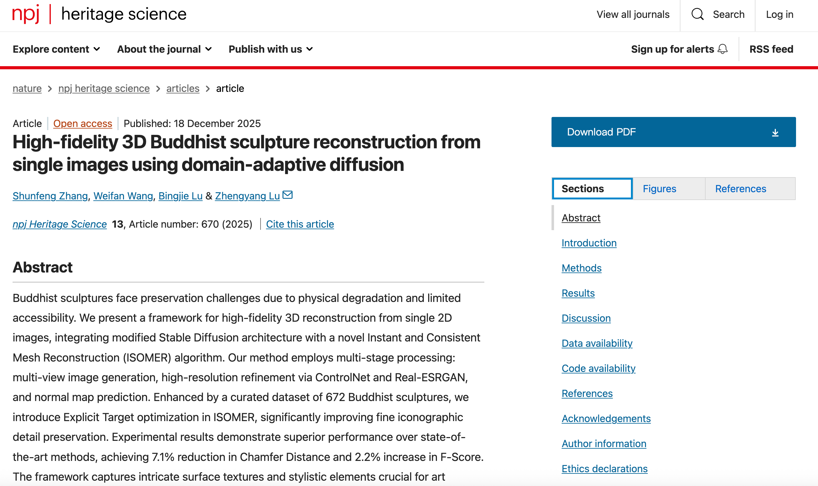 近日,我校传媒与艺术学院张顺峰老师团队以无锡学院为第一单位,在Nature集团旗下权威期刊《npj Heritage Science》发表题为“High-fidelity 3D Buddhist sculpture reconstruction from single images using domain-adaptive diffusion”的研究论文(原文链接:https://doi.org/10.1038/s40494-025-02257-x)。该成果的发表,实现了传媒与艺术学院在高水平科研领域的重大突破。