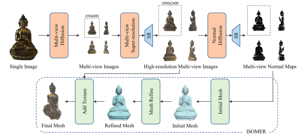 研究团队提出一种基于单张二维图像的佛教雕塑高保真三维重建新框架(如图2所示)。团队通过对特定领域数据的深度挖掘与模型微调,构建了包含不同类别佛教造像的专用数据集;通过改进Stable Diffusion架构,利用ControlNet技术对输入图像进行精确的姿态与边缘控制,并在技术流程中巧妙嵌入了Real-ESRGAN超分辨率模块高幅提升图像分辨率。尤为关键的是,团队创新“即时一致网格重建”(ISOMER)算法,引入“显式目标”(Explicit Target)优化策略,配合可微渲染技术与扩展正则化方法,有效避免了传统体素方法带来的“块状”伪影,创造性解决造像几何模糊与表面细节丢失问题。实验数据结果表明,该框架在Chamfer Distance这一关键几何指标上降低了7.1%,且综合评价指标F-Score提升了2.2%,显著提升了复杂雕塑细节和图像元素的精度和文化真实性,为数字文化遗产保护领域的技术升级与应用拓展提供了重要支撑。