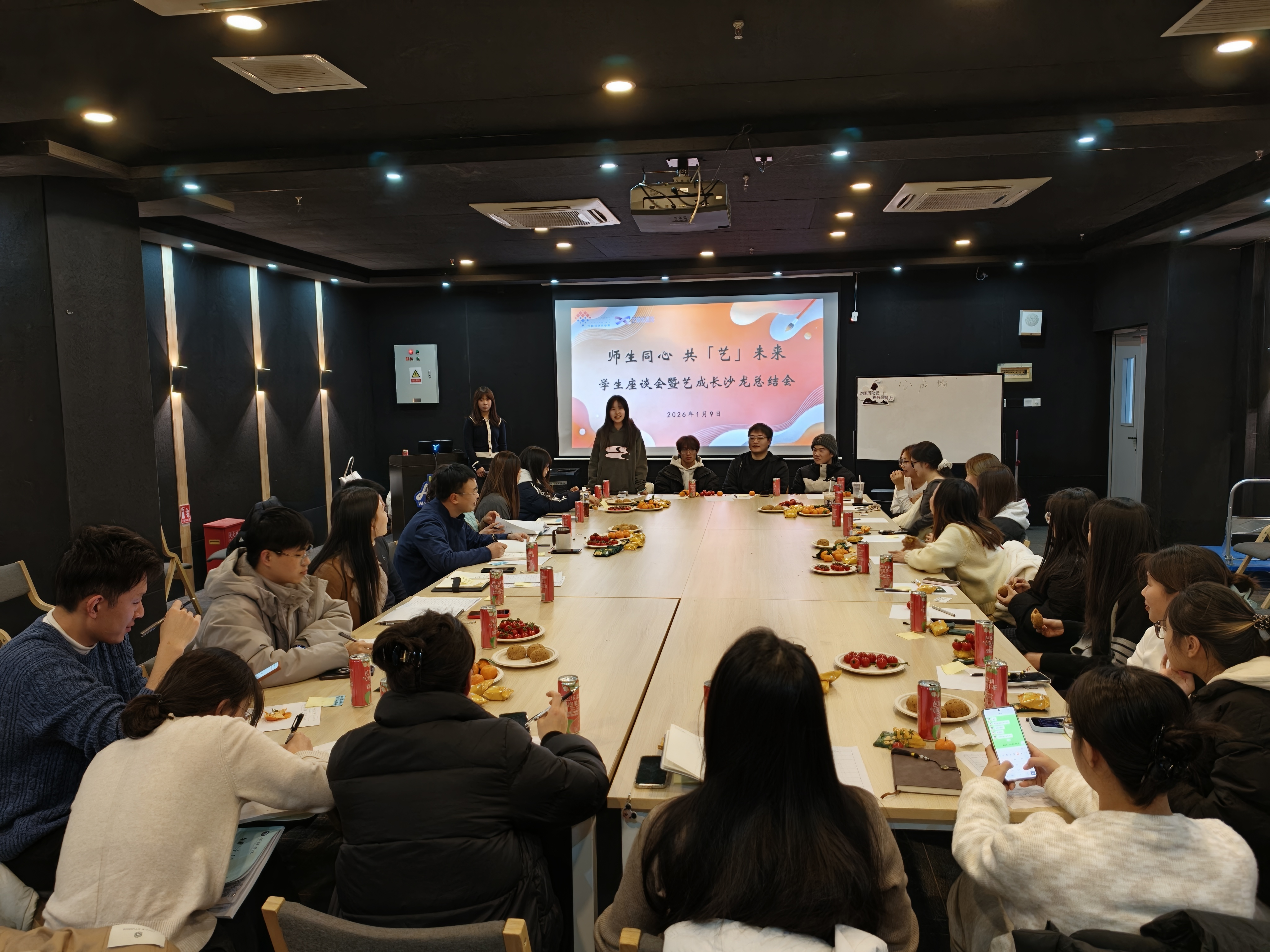 1月9日,传媒与艺术学院“师生同心,共‘艺’未来”艺成长沙龙总结座谈会在尚诚楼110教室成功举行。学院党总支副书记郭新宇、学院行政及教辅人员、各系专业教师出席会议,与学生代表齐聚一堂,围绕系列沙龙活动开展总结交流,共话师生协同发展路径。