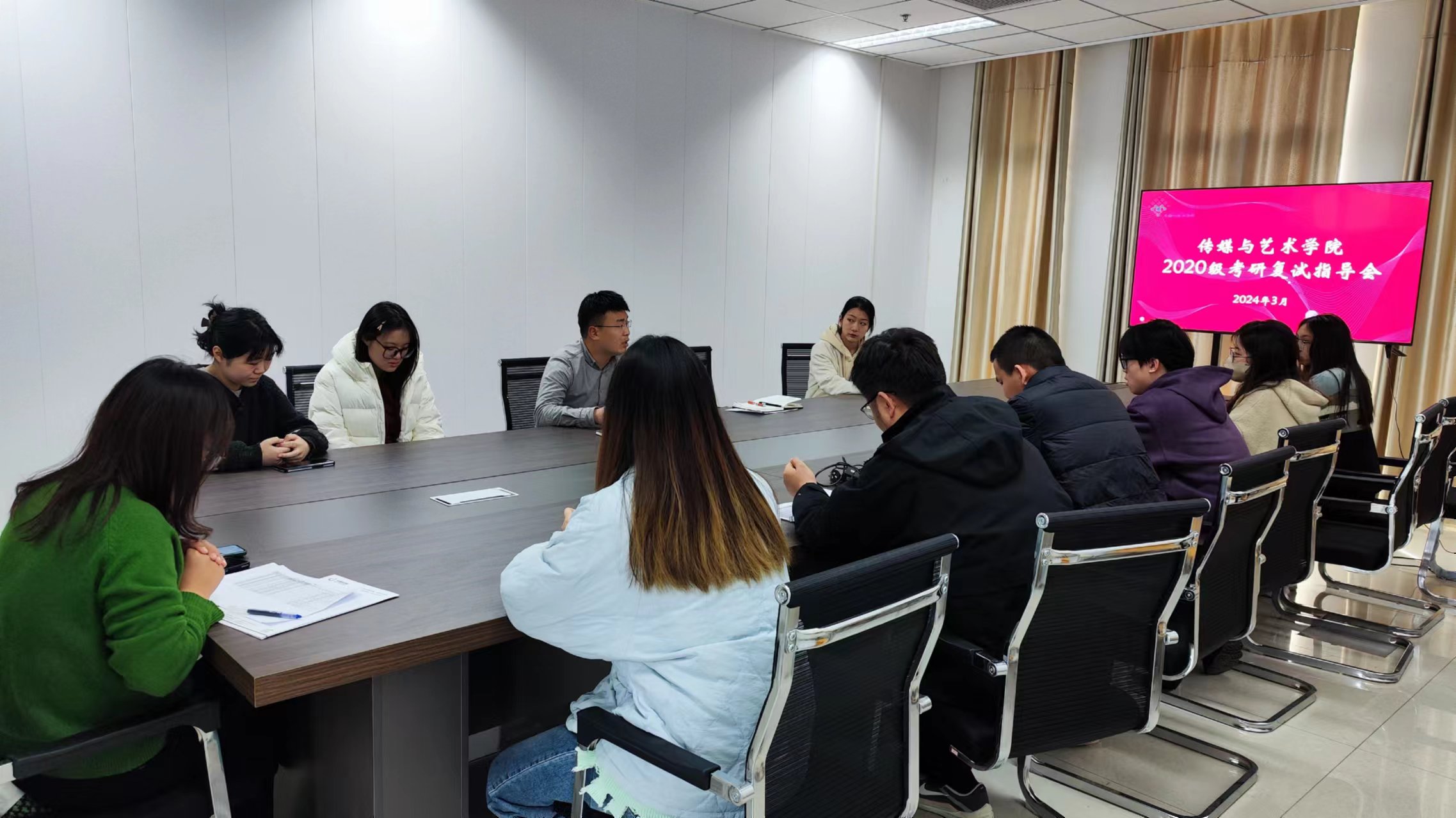 为做好2024届考研学生复试调剂指导工作,帮助考研学生全面了解复试、调剂政策,科学高效备考复习,月19日传媒与艺术学院在尚诚楼召开2024届考研复试指导会。学院党总支副书记郭新宇、辅导员张晓娜以及考研上线的十余名学生参加了会议,同时还邀请了专业考研指导老师到场进行现场指导讲解。