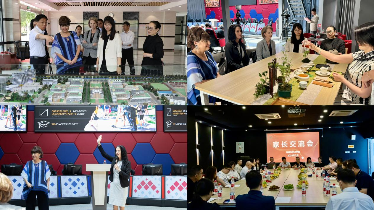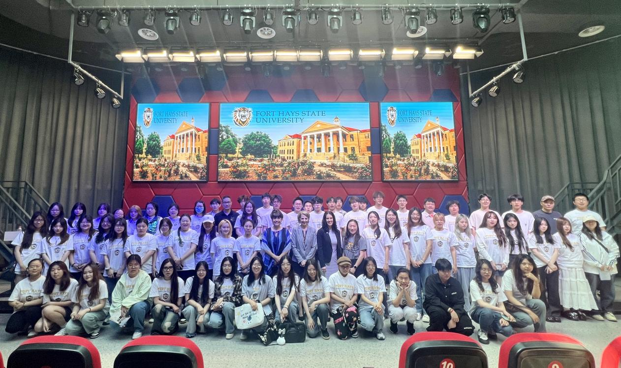 下午,富特海斯州立大学校领导一行与我校数字媒体艺术中美合作办学专业学生和家长举行见面会。Tisa Mason校长向学生简要介绍了富特海斯州立大学的建校历史、地理位置、学科设置和校园文化等情况。传媒与艺术学院院长助理陈曦从教育教学、学生活动、英语能力提升等方面介绍了中美合作办学专业学生的培养情况。随后,Jill Arensdorf副校长与Jeni McRay助理教务长为学生带来专题讲座,分享了专业学习、奖学金政策、硕士申请、校园生活和课余活动等内容,并就学生关心的语言学习、跨文化适应、继续深造等问题做了详细说明和解答,学生和家长反响热烈。活动中,Tisa Mason校长一行参观了学校沙盘,体验了传统非遗文化茶艺表演,并与身穿富特海斯州立大学校服的合作办学专业学生亲切合影。